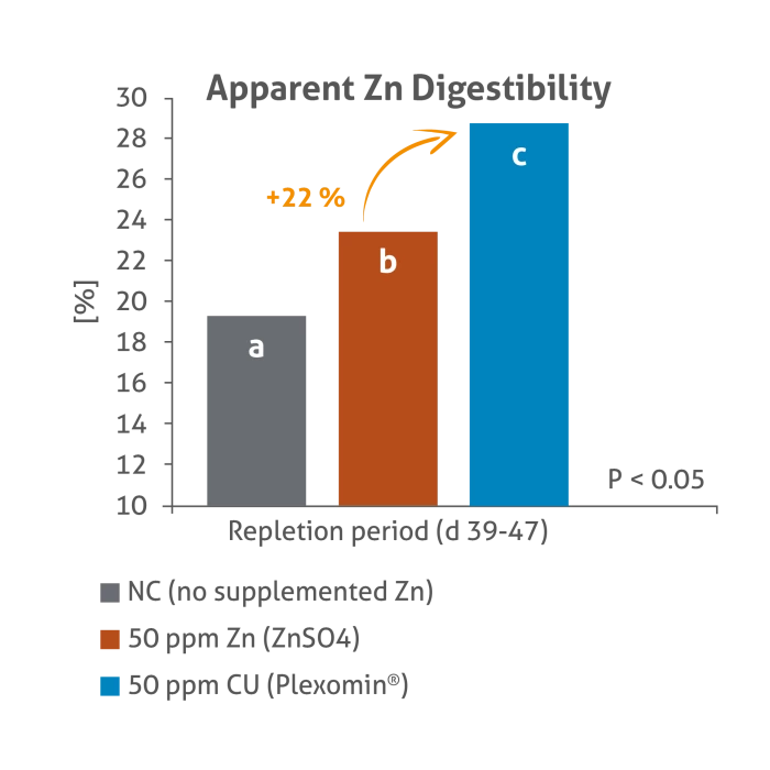 The decisive factor for these effects is the bioavailability of the trace mineral source. A study at Freie Universität Berlin compared inorganic zinc sulfate with zinc glycinate (Plexomin®) and demonstrated around 22% higher relative bioavailability for zinc glycinate. Similar findings were reported by Männer, Simon, and Schlegel (2008), who investigated the bioavailability of different sources of zinc, copper, manganese, and iron.