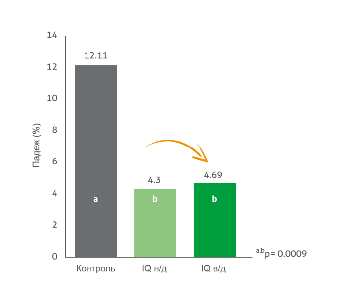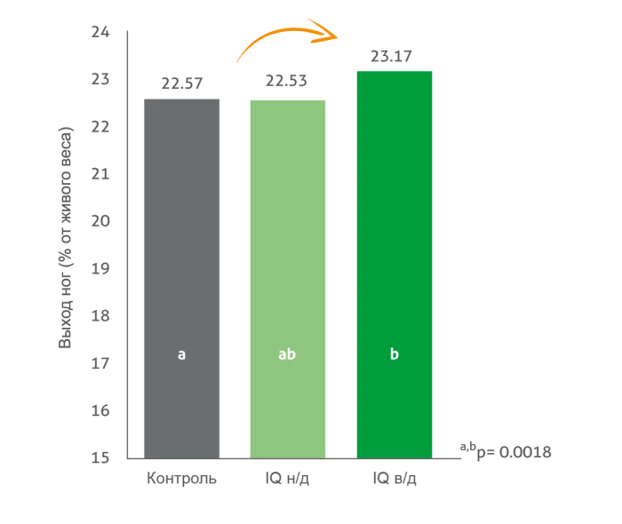 При убое выход туши и доля высокоценных отрубов служат важнейшими экономическими показателями. Преимущества IQ в этом отношении были наглядно продемонстрированы в исследовании, проведенном в Университете штата Миссисипи, США. В исследовании использовалась модель применения живой вакцины против кокцидиоза, вводимой на нулевой, 14-й и 42-й дни, а наблюдение за птицами велось до 56-го дня. Бройлеры, которым давали IQ, демонстрировали значительно более низкую смертность (рисунок 1), более высокое потребление корма (контрольная группа: 109,2 г/гол./день; IQ низкая дозировка: 116,3 г/гол./день; IQ высокая дозировка: 117,5 г/гол./день; p = 0,0015) и более высокий выход мяса с ног относительно живой массы (рисунок 2).