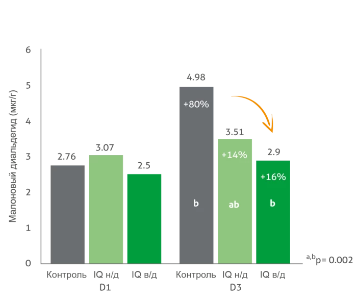 Чтобы оценить, как окислительный стресс может продолжаться после убоя, в Университете Аристотеля в Салониках (Греция) было проведено научное исследование. Исследователи изучали окисление липидов в сыром мясе грудки (большая грудная мышца) во время хранения в холодильнике при температуре 4°C. Анализировали подвыборки на первый и третий день. У птиц, получавших добавки IQ, наблюдалась лишь умеренная окислительная деградация, что свидетельствует об усиленной антиоксидантной защите или меньшей восприимчивости к окислению по сравнению с контрольной группой (рисунок 4). Кроме того, у птиц, получавших корм с IQ, наблюдалось более высокое содержание белка в грудных мышцах (контрольная группа: 23,9%; низкий IQ: 24,8%; высокий IQ: 24,1%) и пониженное содержание жира в грудке (контрольная группа: 1,75%; низкая дозировка IQ: 1,47%; высокая дозировка IQ: 1,58%), что указывает на переход к более постным и качественным вырезкам мяса.