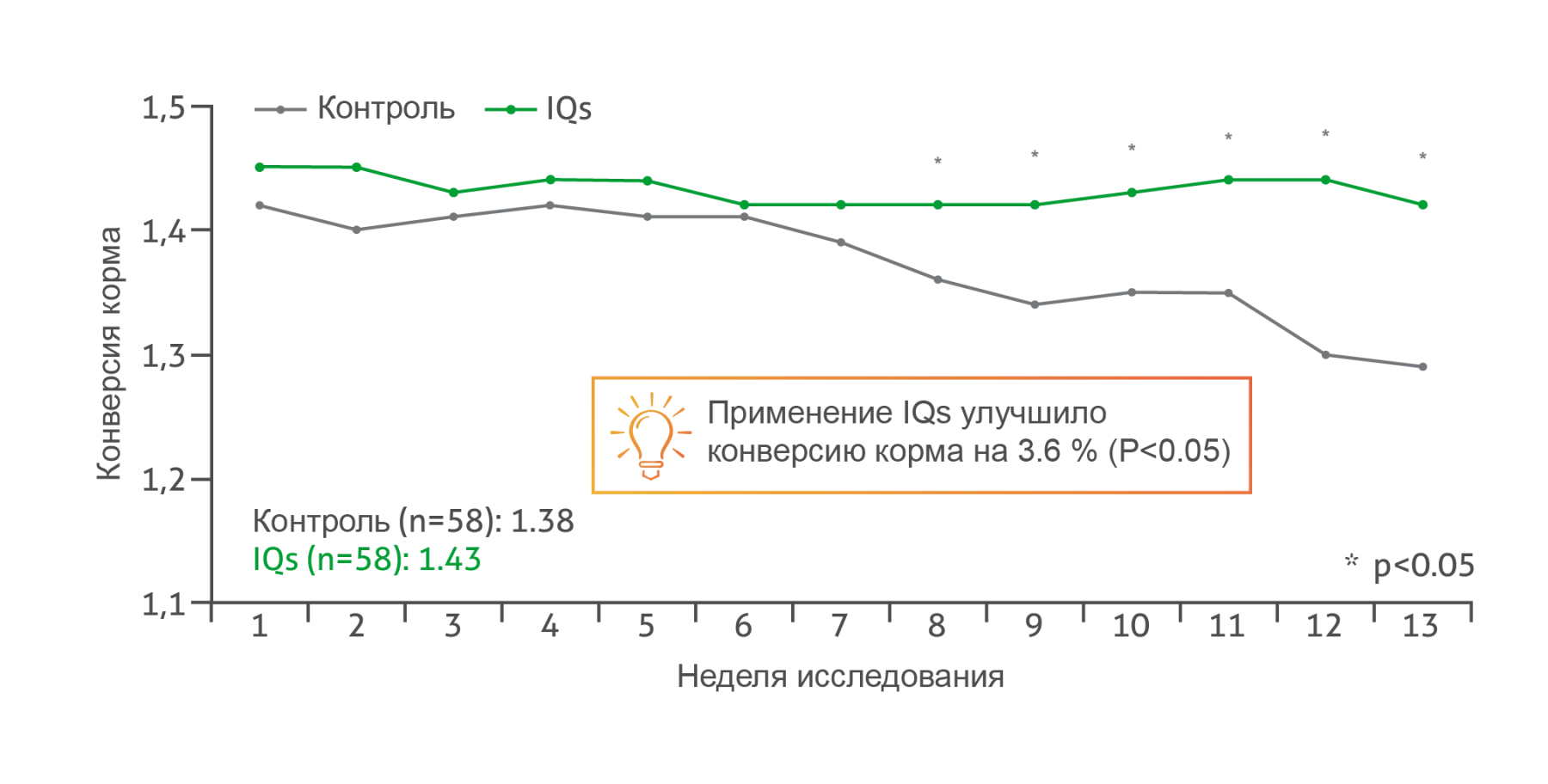 В среднем применение IQs привело к значительному (p ≤ 0,05) увеличению надоев на 2,8 % (Рис. 1). Эффект стал более выраженным после восьминедельного опытного периода. Различий в потреблении корма и кондиции тела между обеими группами не наблюдалось, что привело к значительному повышению эффективности кормления животных, получавших IQs (Рис. 2). Опять же, этот эффект стал более выраженным после восьминедельного опытного периода. Изменений в компонентах молока между обеими группами не наблюдалось, но наблюдалась тенденция к снижению количества соматических клеток в группах, получавших IQs (-28 %, p = 0,06). Уровни кортизола в плазме оценивались в начале опыта и через 60 дней. Хотя в начале исследования различий не наблюдалось, в группе, получавшей добавку с IQs, были получены значительно более низкие уровни кортизола, что указывает на более сдержанную реакцию на стресс (Рис. 3). Хотя хромота наблюдалась у 24 % коров контрольной группы, в группе IQs количество животных с хромотой было значительно меньше (10 %). Кроме того, количество случаев хромоты, требующих лечения антибиотиками, было значительно снижено в группе, получавшей добавки IQs (6,9 % против 0 %, соответственно). В результате в группе с IQs достигнута окупаемость инвестиций в размере 5,5 %. Для оптимальной эффективности добавки с IQs следует учесть период адаптации не менее 6, а предпочтительно 8 недель.