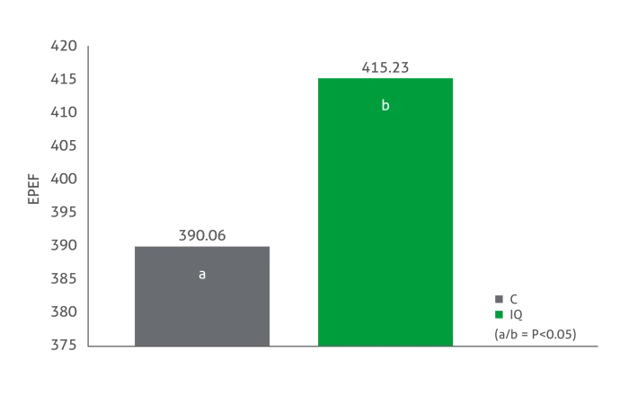 Конечная живая масса на 35-й день и среднесуточный прирост массы тела значительно увеличились в группе, получавшей IQ, по сравнению с контрольной группой (p < 0,05; рисунок 2). Среднесуточное потребление корма и коэффициент конверсии корма улучшились в группах, получавших IQ, но изменения не достигли уровня значимости. Уровни смертности (1 д. – 35 д.) составили 3,65 % (C) и 2,60 % (IQ). Общая эффективность выращивания улучшилась, о чем свидетельствует значительно более высокий Европейский фактор эффективности производства (Рисунок 3). Уровень кортикостерона в сыворотке, измеренный на 28-й день, был значительно снижен в группе, получавшей IQ (p < 0,01), а сывороточный овотрансферрин показал еще более сильное и значимое снижение (p < 0,001) в группе, получавшей IQ, по сравнению с птицами контрольной группы (Рисунок 4).