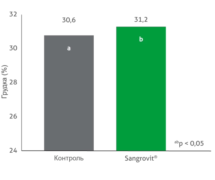 Sangrovit® 3-го поколения обеспечивает больше мяса грудки, лучшую защиту от окисления и превосходное качество, а также повышает продуктивность птиц за счет улучшения конверсии корма и увеличения массы тела.